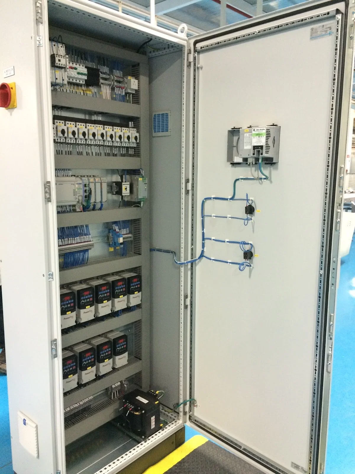 Electrical control panel with wiring, circuit breakers, and electronic components inside an open gray metal cabinet.